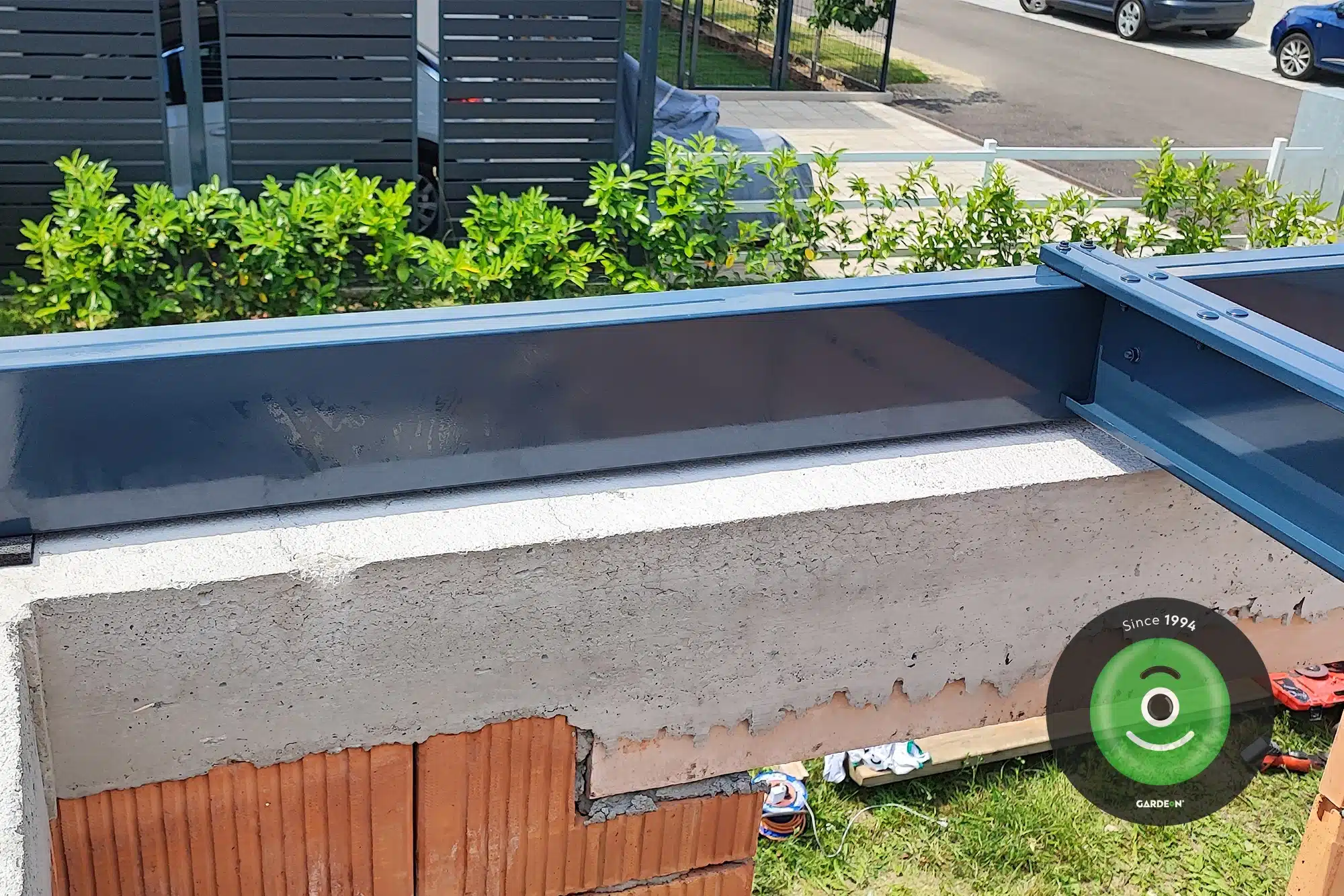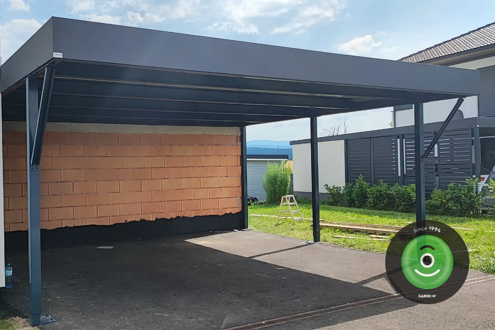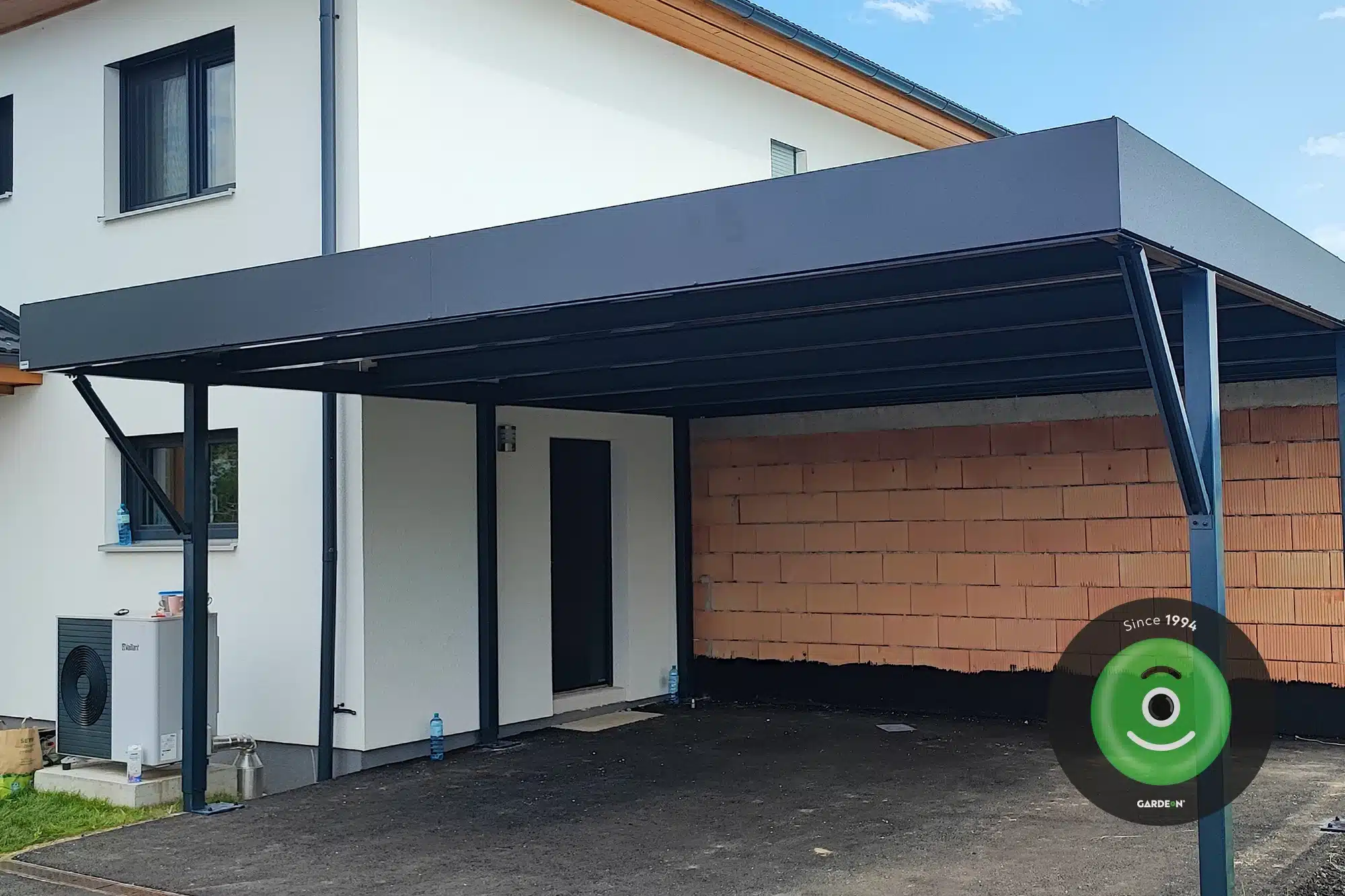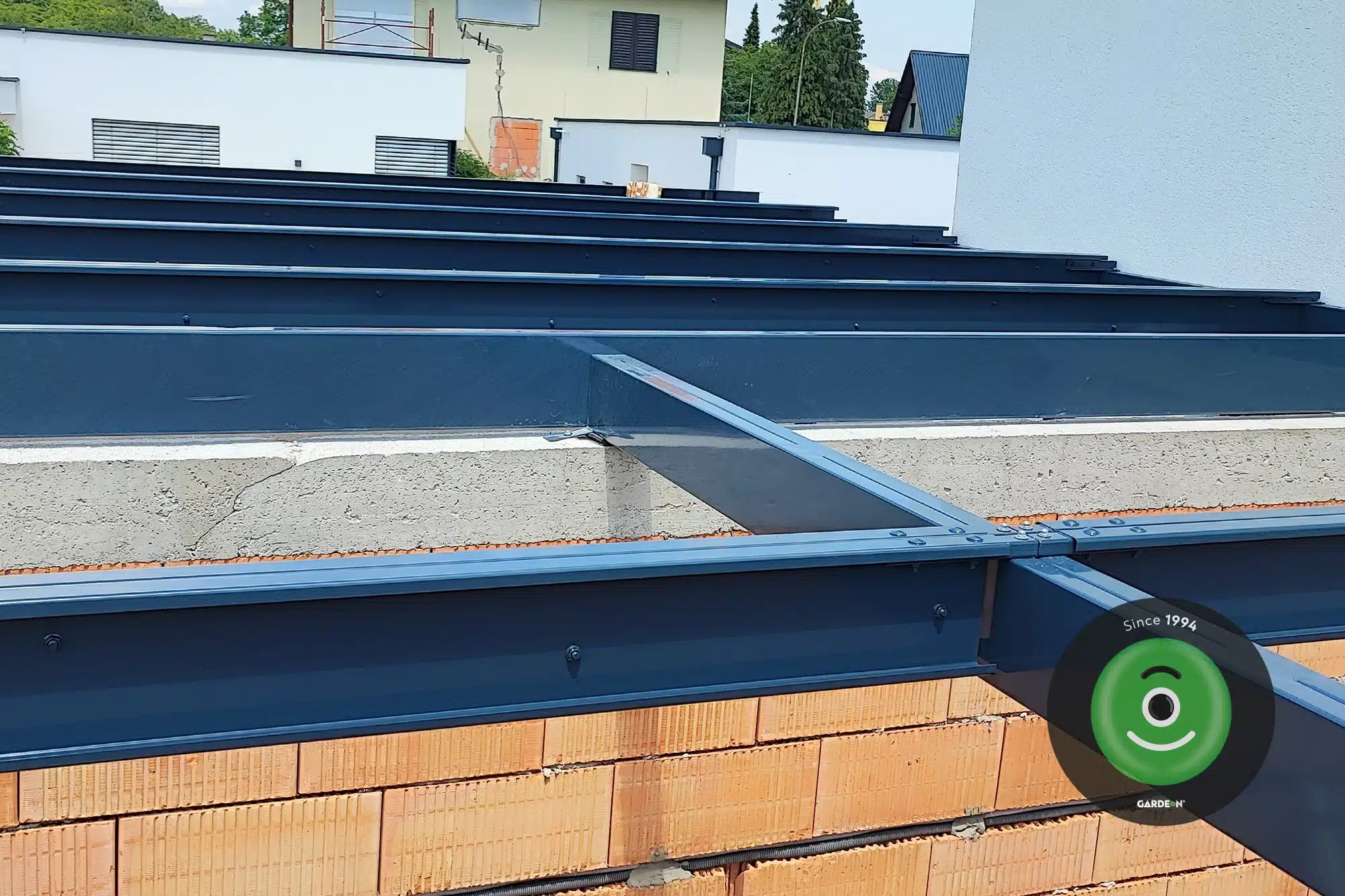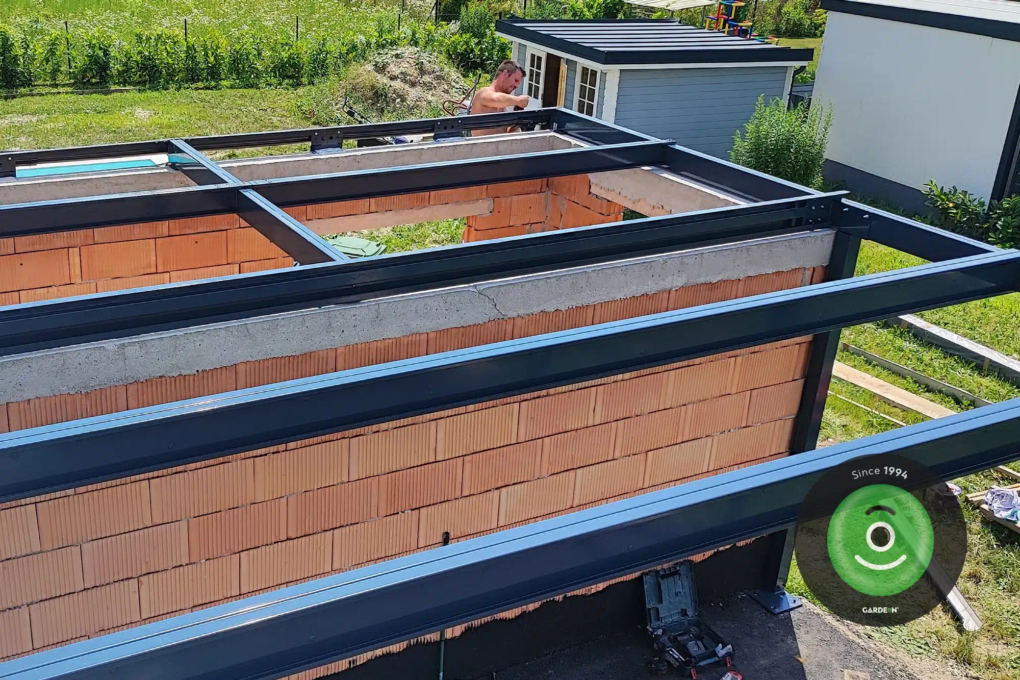 Na mieru sme navrhli a zhotovili oceľovú stĺpikovú konštrukciu, ktorá nesie montovanú plochú strechu – tá je spoločná pre nedokončený záhradný domček aj pre nadväzujúci prístrešok. Samozrejme, príprava nejaký čas trvala, no po príchode na miesto určenia trvalo našim montážnikom len niekoľko hodín, kým bola murovaná stavba pod strechou a pred ňou stál hotový prístrešok pre auto.