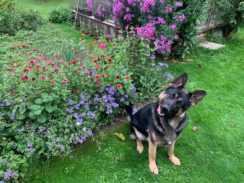 Pes sedí s vyplazeným jazykom pri kvetoch v záhrade