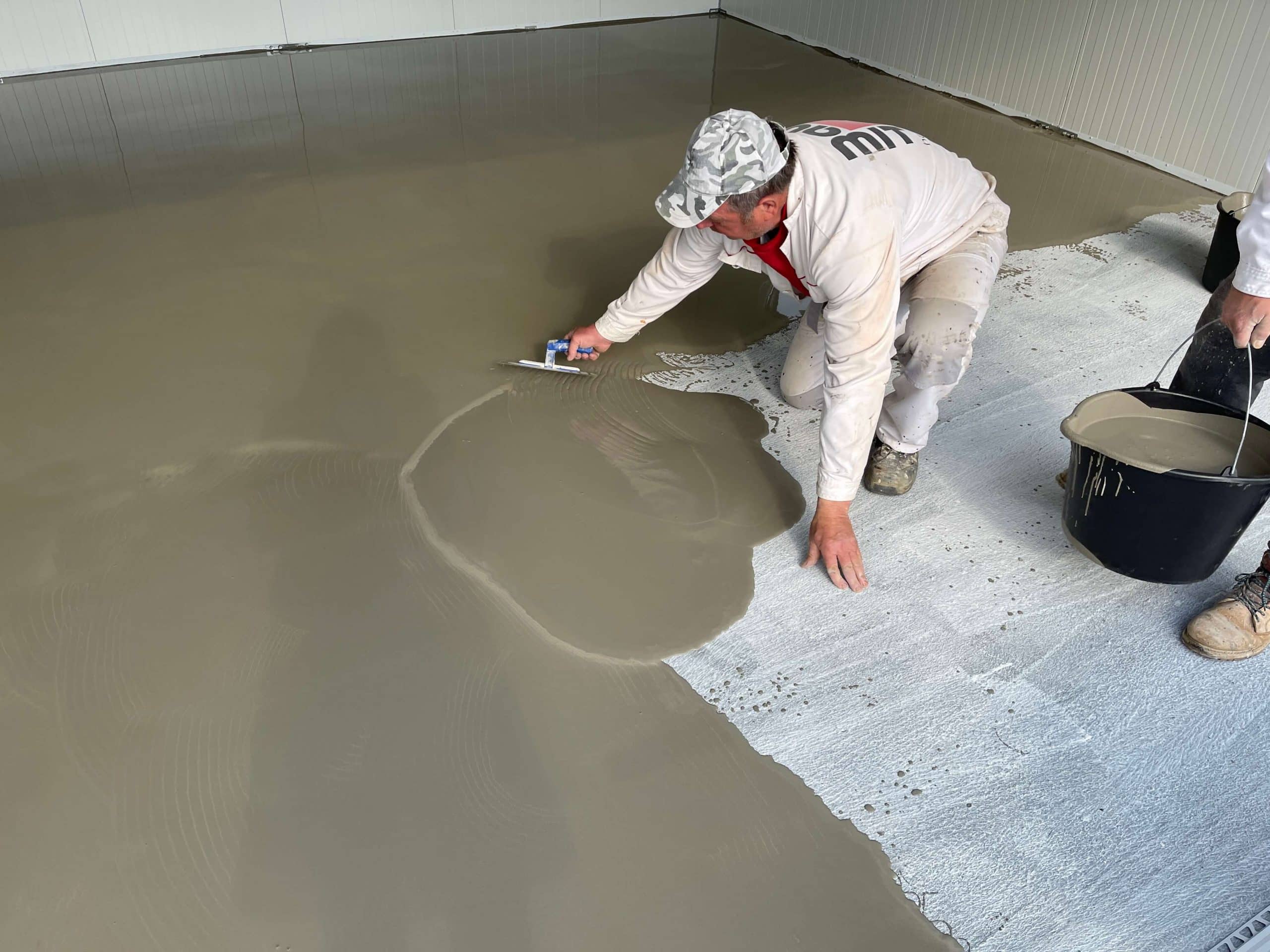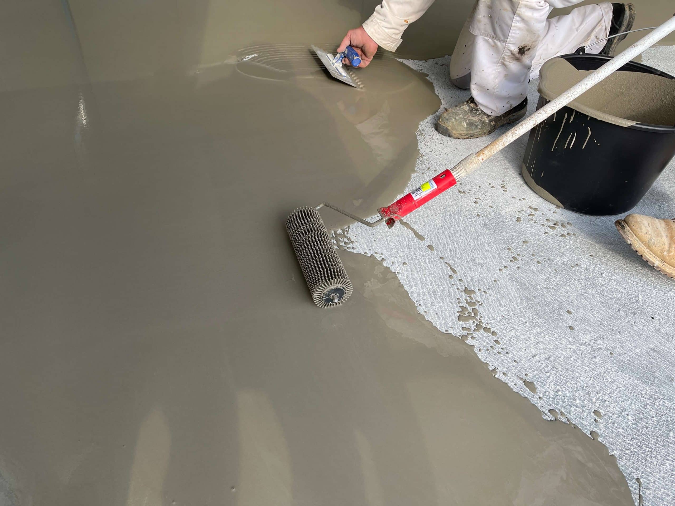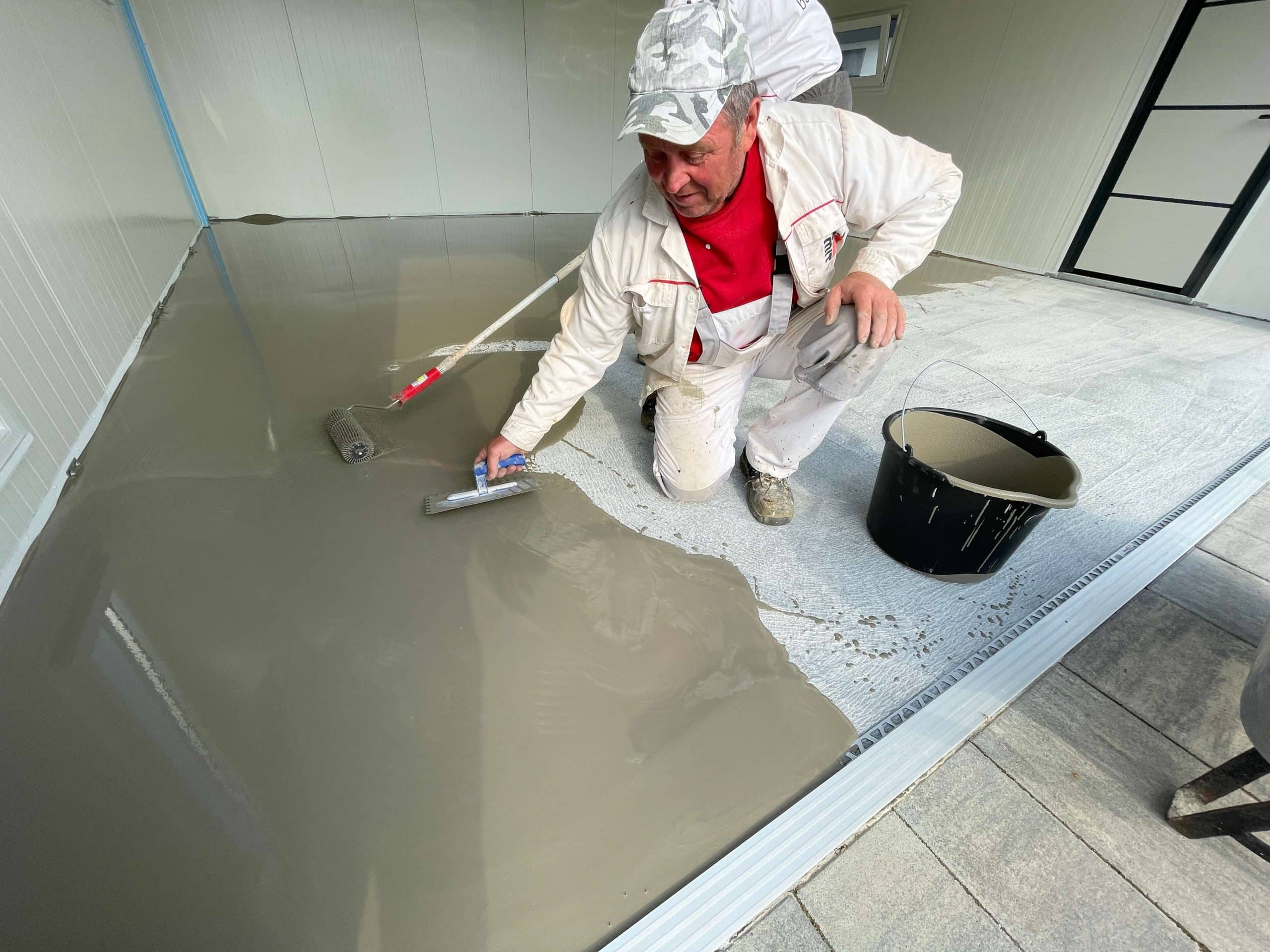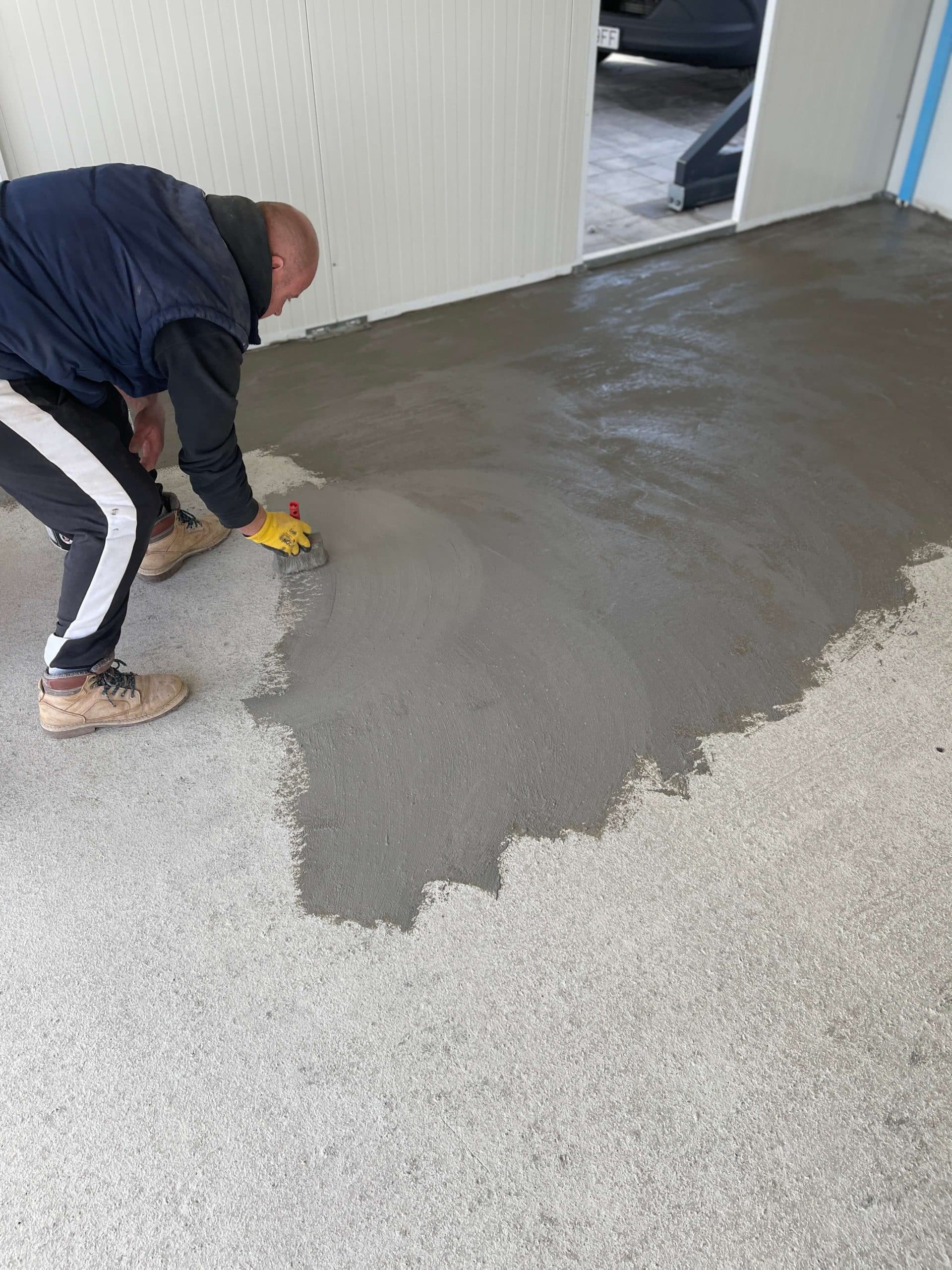 Po zaizolovaní betónu môžete naniesť samonivelačný poter vhodný do exteriéru. Ten vytvorí v garáži perfektný podklad pod dlažbu alebo liatu epoxidovú podlahu. Najskôr je však potrebné aplikovať adhézny mostík (stačí v jednej vrstve), čo je vysoko priľnavý náter ktorý zabezpečí, aby sa vrstva hydroizolácie a cementová nivelačná stierka spojili.