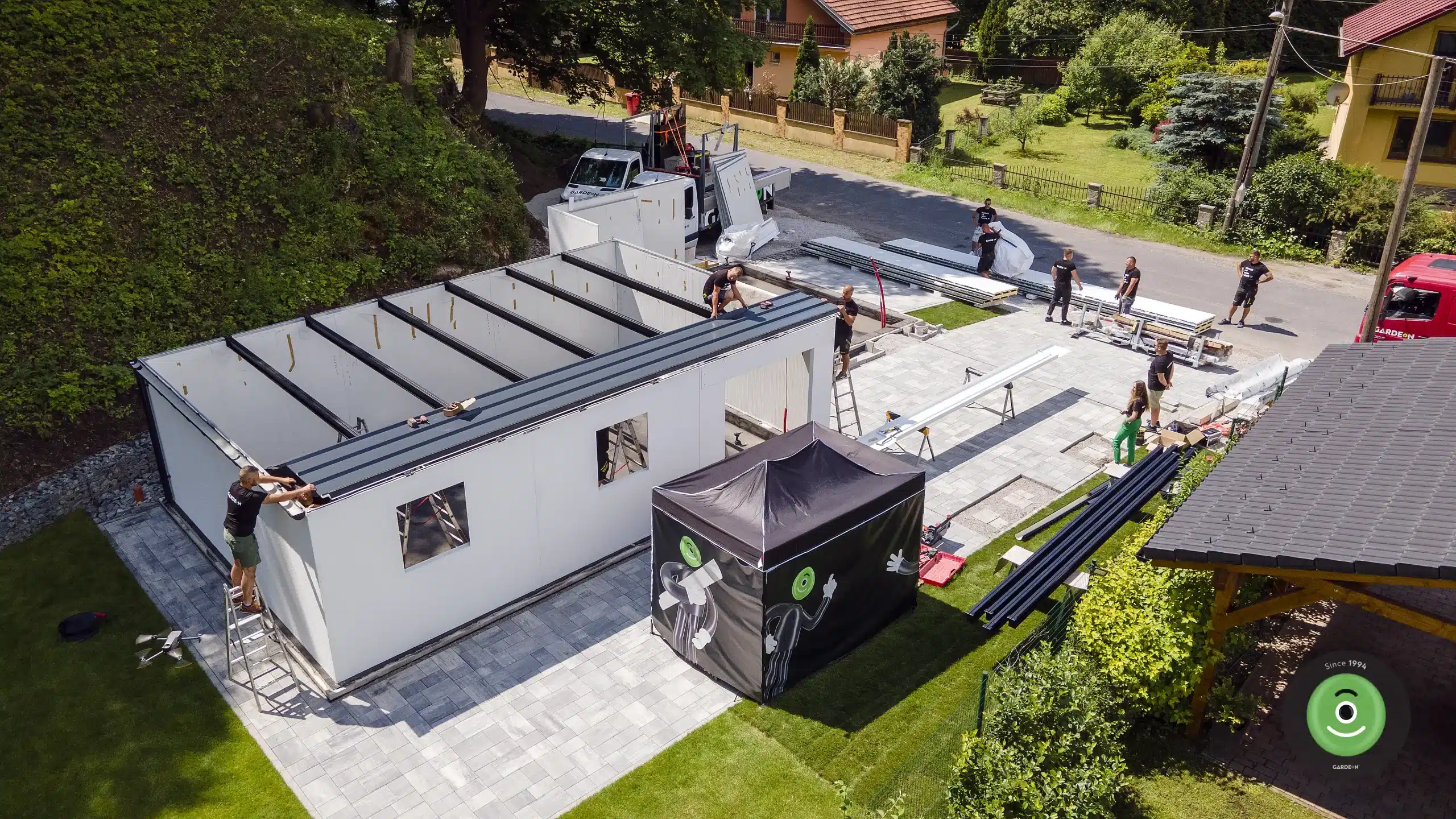 Montáž stavieb z oceľových panelov nie je práca pre každého. Je fyzicky náročná a vyžaduje si poriadnu silu, no dôležitá je pri nej aj precíznosť a detaily – aby boli všetky tri objekty navzájom presne zarovnané, aby všetko fungovalo tak, ako má, aby na strope nekondenzovala voda, aby brána chodila ako po masle, aby bol každý detail perfektný… Presne vyhotovené panely s premyslenou konštrukciou sú však základom rýchlej výstavby a našim chlapom nechýba ani sila, ani šikovnosť, ani nadšenie. Robota im išla tak od ruky, že im popri nej ostal čas aj na kávičku. A čo Rasťa potešilo najviac? (Teda okrem hotových stavieb.) Po odchode montážnikov bol pozemok vzorne uprataný. Takáto stavba sa tak podľa jeho slov môže pokojne realizovať aj v upravenej záhrade v plnom kvete.