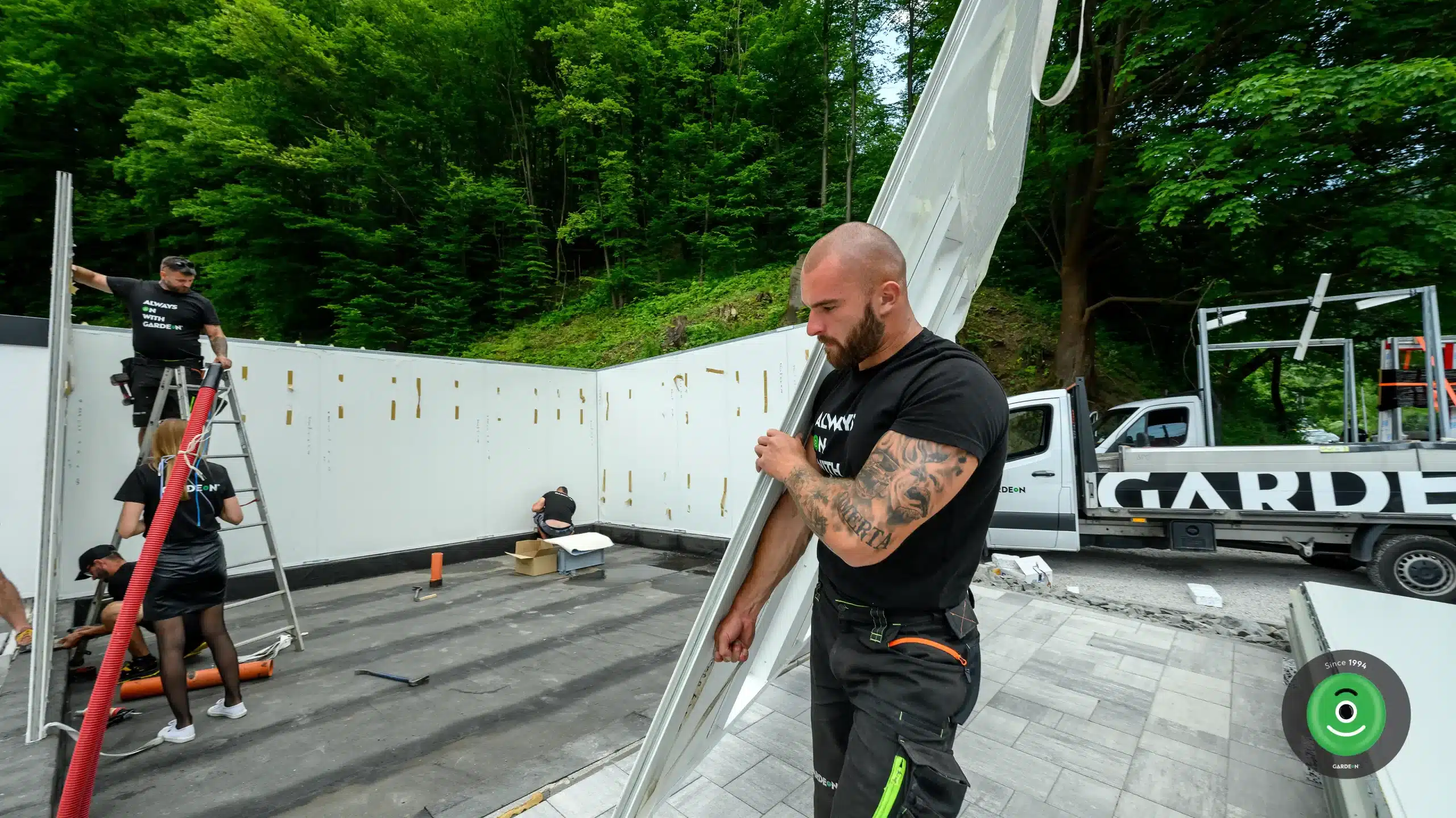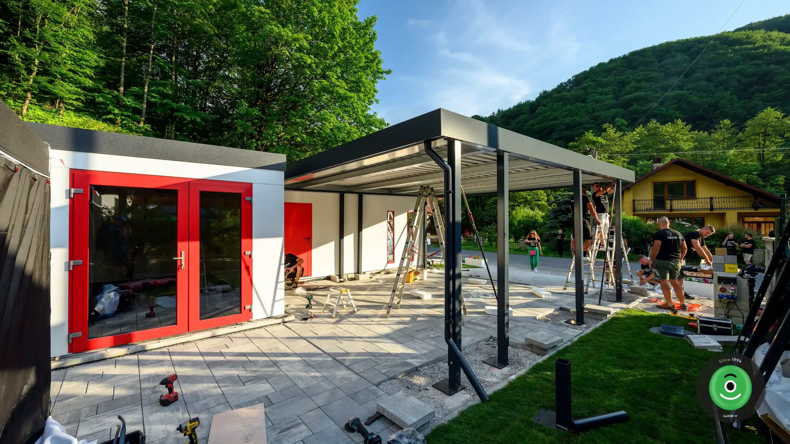 Prvé získalo reálne kontúry štúdio. Po zmontovaní jeho stien prišla na rad garáž a – valník Mercedes s atypickým, najväčším a najdlhším nákladom. Vykladanie až 9 m dlhých strešných panelov na úzkej ceste vyzeralo už na prvý pohľad ako zvláštna výzva, no pre náš skúsený tím to nebola žiadna neprekonateľná prekážka. Ako tretí sa začal stavať veľký prístrešok s rozmermi 7 x 6 m, so špeciálnym panelom na wall-box, LED osvetlením a ďalšími modernými vychytávkami.