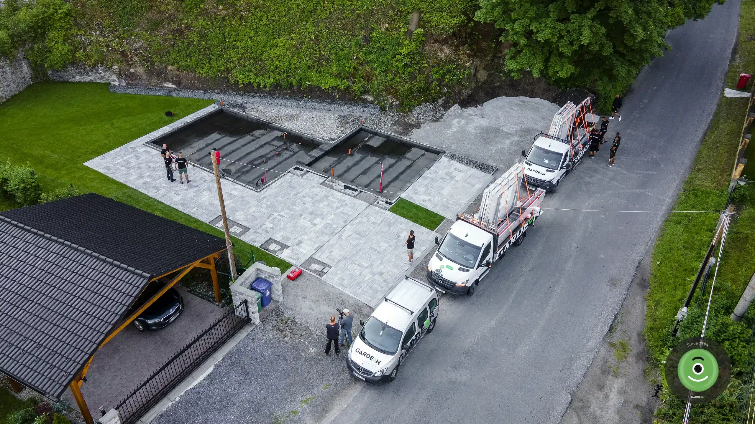 Podľa Rasťových požiadaviek sme v Gardeone zabezpečili kompletnú projektovú dokumentáciu a na jeseň roku 2022 dostala Garáž.tv stavebné povolenie. Geodet potom vyznačil stavbu a vo februári sa začalo s vysušovaním pozemku, ktorý v zime zaplavila voda. V polovici marca sa potom stavebná firma pustila do realizácie základov. Tie boli do konca mesiaca hotové, a to aj so žumpou a pripravenými rozvodmi vody a elektriny. Nasledovalo vyrovnanie okolia a jeho úprava, čo bolo v tomto prípade naozaj náročné. No nakoniec bol pozemok v deň D vzorne pripravený a upravený – vrátane ukážkového trávnika z trávnych kobercov a štýlových oporných múrov z gabiónov.