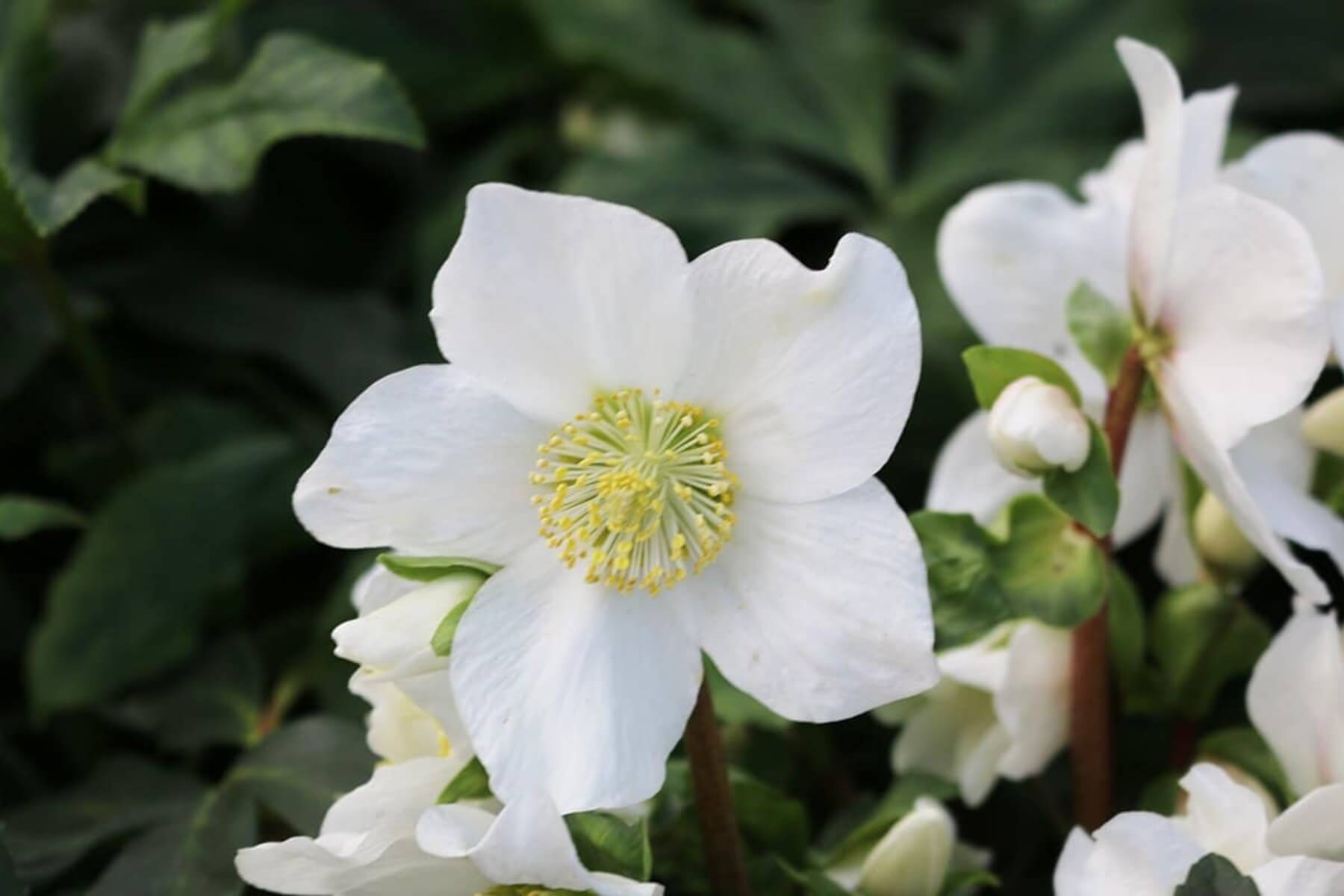 Čemerica čierna: Táto rastlina so snehobielymi kvetmi je ideálna do kvetináčov na terasu pri domčeku, kde vytvára jemný a elegantný dojem.