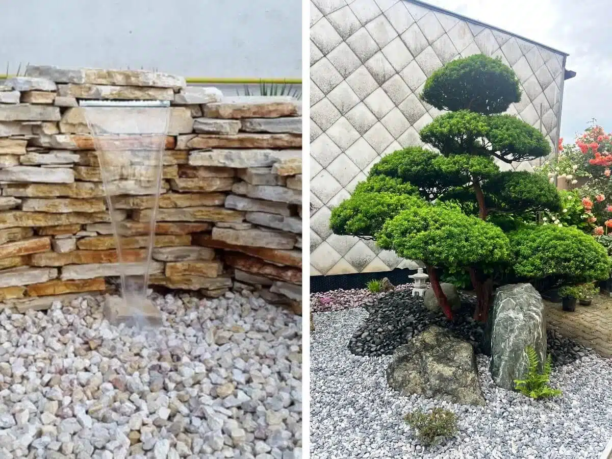 Kamenné prvky zapúšťame do zeme a strategicky umiestňujeme okolo vody a kombinujeme ich s rastlinami, ktoré majú rady vlhkosť. Zvyšné kamene využijeme na vybudovanie trás chodníkov, buď vo forme štrku alebo ako kamenné šľapáky.