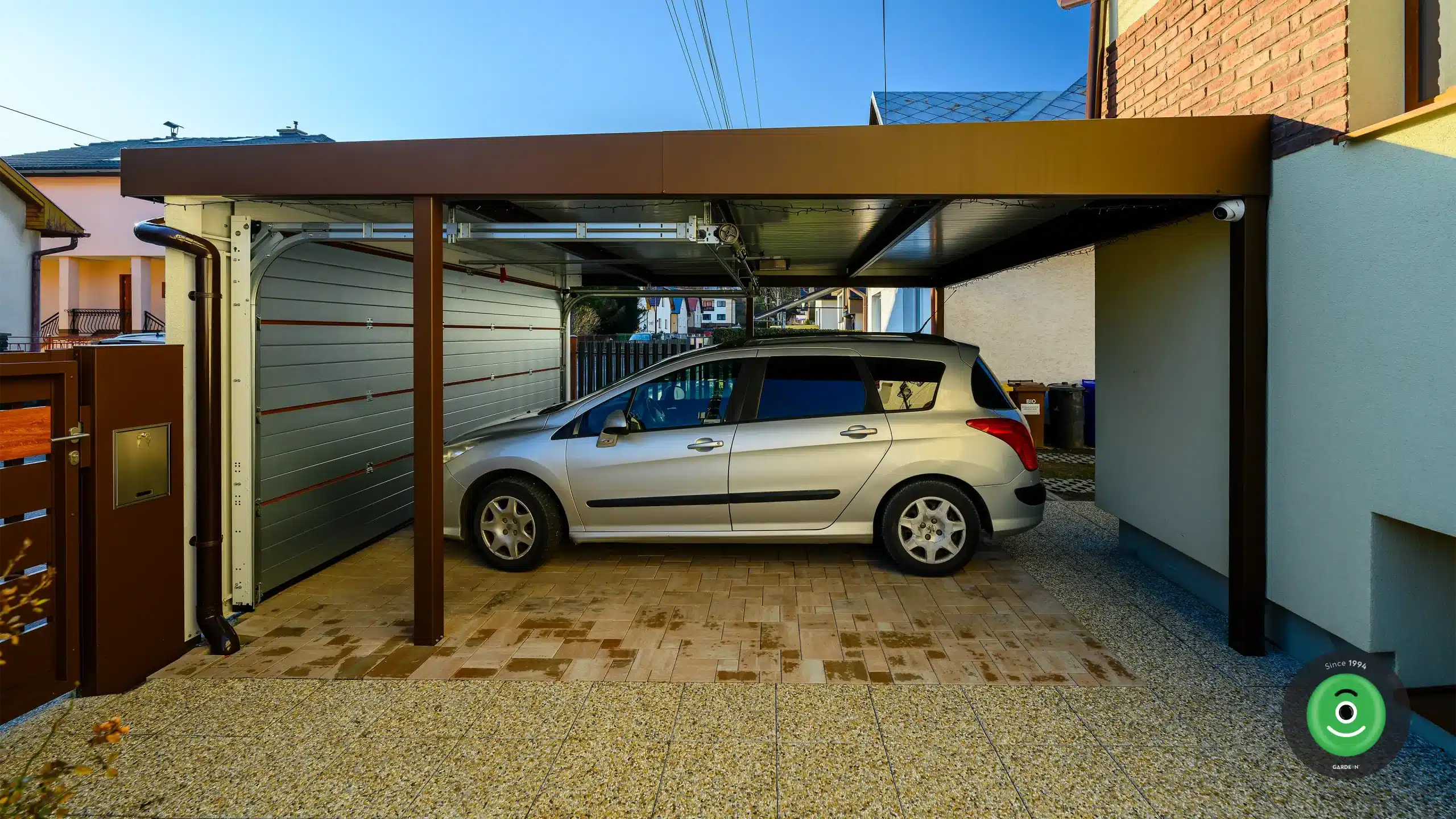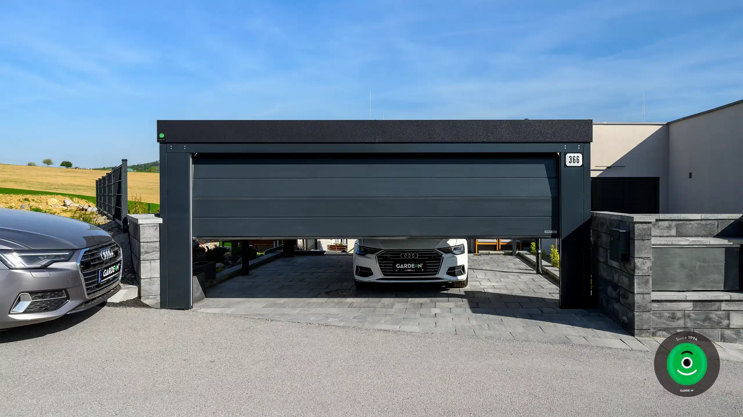 Oceľové montované prístrešky GARDEON s garážovou bránou predstavujú praktické a bezpečné riešenia parkovania, ktoré sa dokáže prispôsobiť vašim potrebám aj vášmu vkusu.