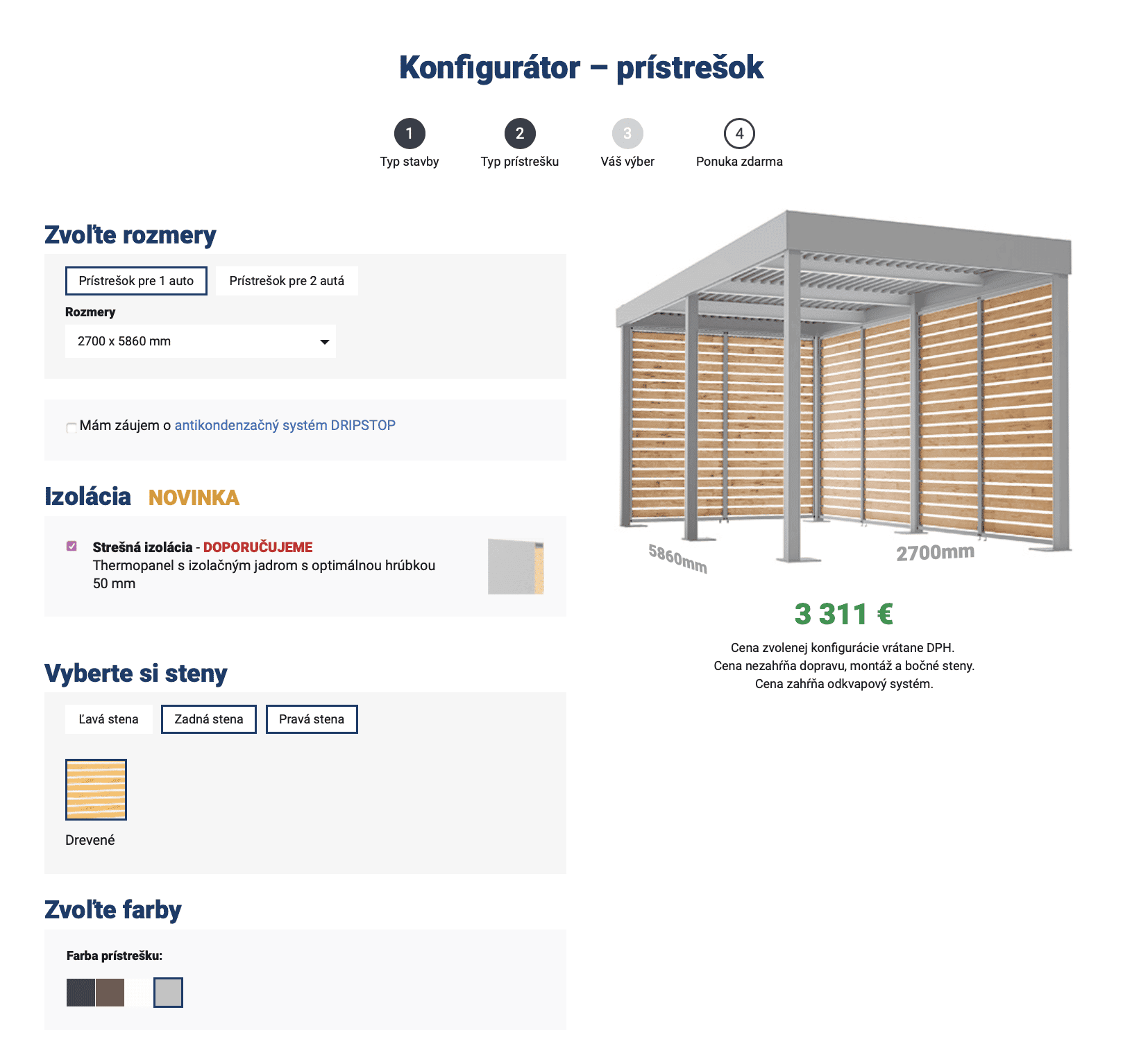 Zvolíte si rozmery, vyberiete si typ a umiestnenie výplňových panelov, alternatívu zastrešenia, a samozrejme, farebnosť aká sa vám páči a ladí s okolím. Stačí len vedieť, čo potrebujete a čo by vám vyhovovalo, náš konfigurátor vás prevedie celým návrhom tak, aby ste na nič dôležité nezabudli. A ak vám nevyhovuje štandardná ponuka, nie je problém ani atypický montovaný prístrešok na mieru – pokojne nás kontaktujte a my vám navrhneme presne taký, aký potrebujete.