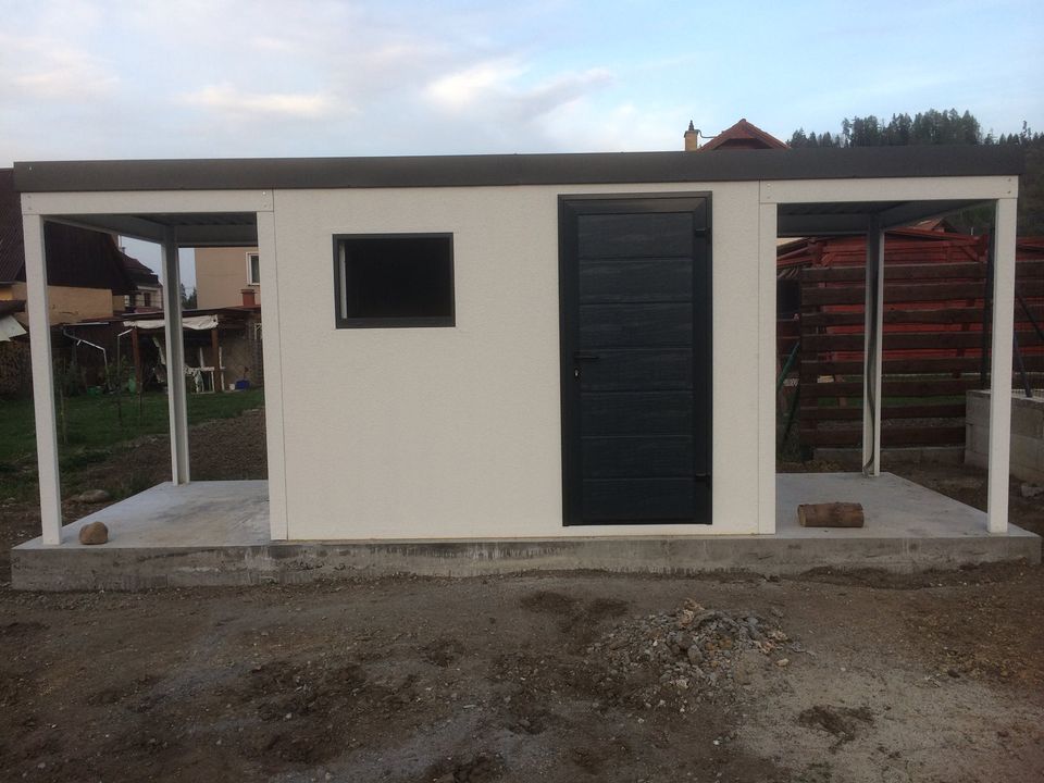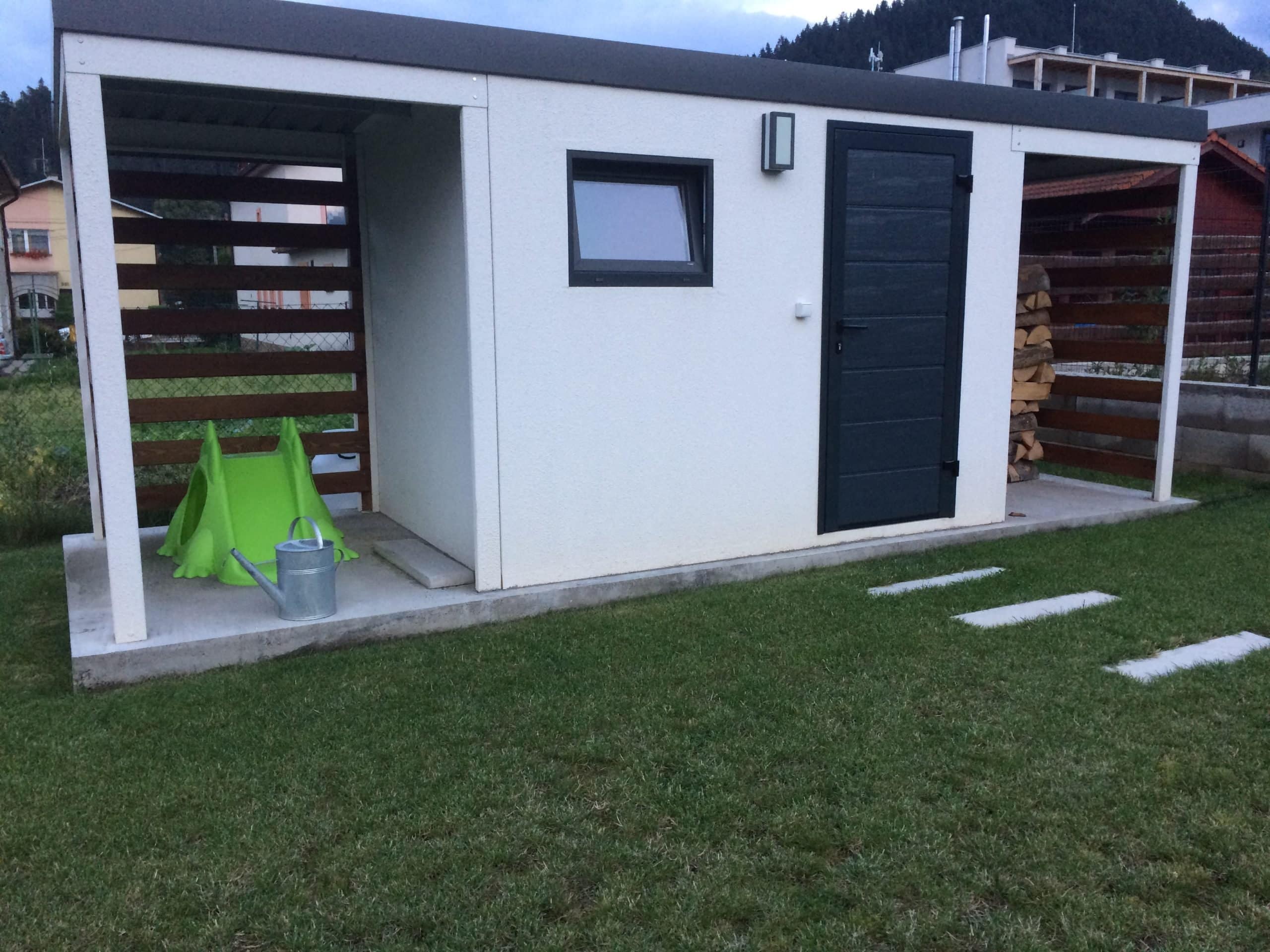 Pani Bobčáková si v septembri roku 2018 na našej stránke vyklikala konfigurátor na záhradný domček, ktorý ju veľmi zaujal. Po vzájomnej konzultácií sme potom na ľavú a pravú stranu pridali aj prístrešky (napr. na posedie, uskladnenie dreva).