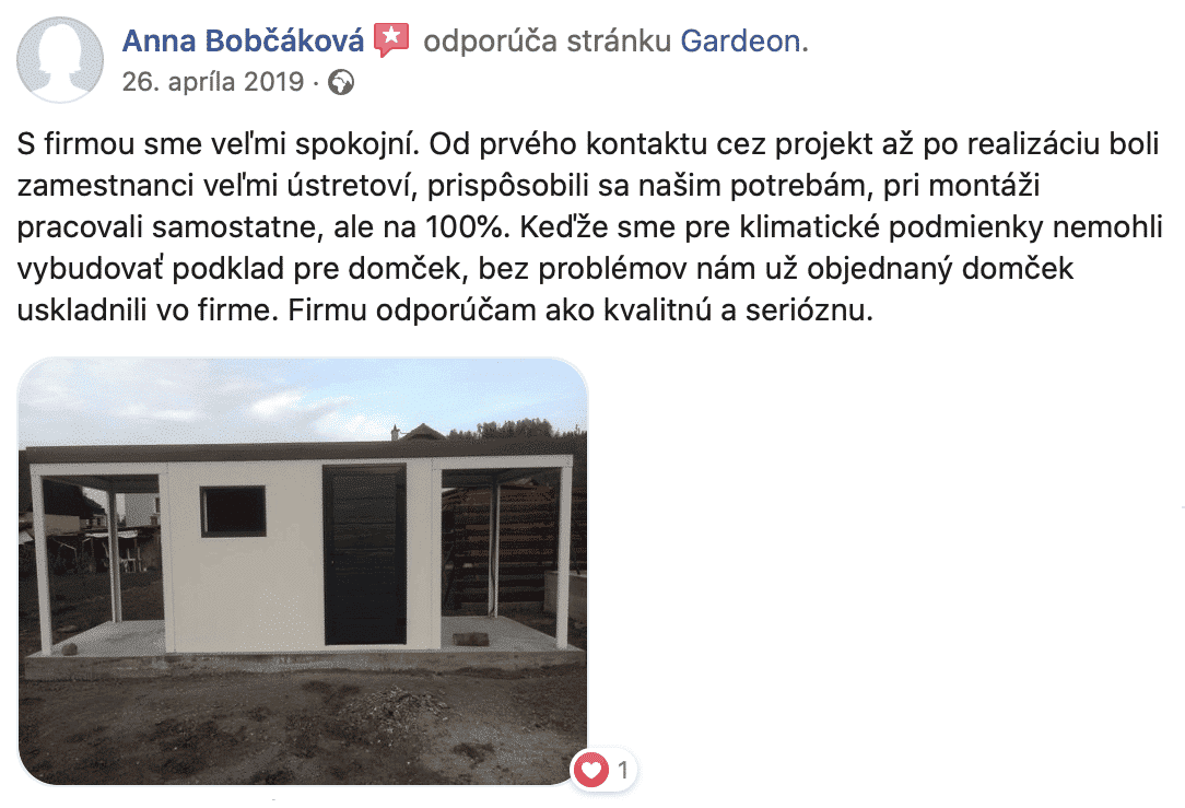 „So záhradným domčekom sme veľmi spokojní. Doplňuje našu záhradu. Je v ňom dostatok miesta na uloženie záhradných potrieb a sezónnych vecí. Máme tam aj stôl a elektrický varič na zaváranie. Vo vonkajších výklenkoch je dosť miesta na uloženie dreva do krbu. Anka„