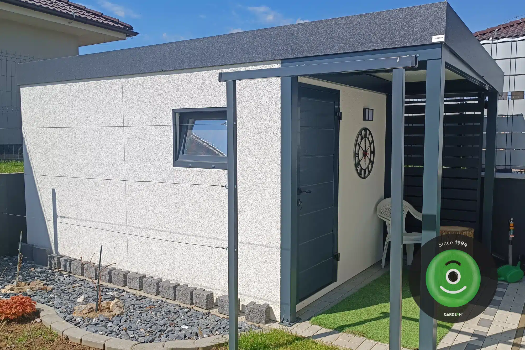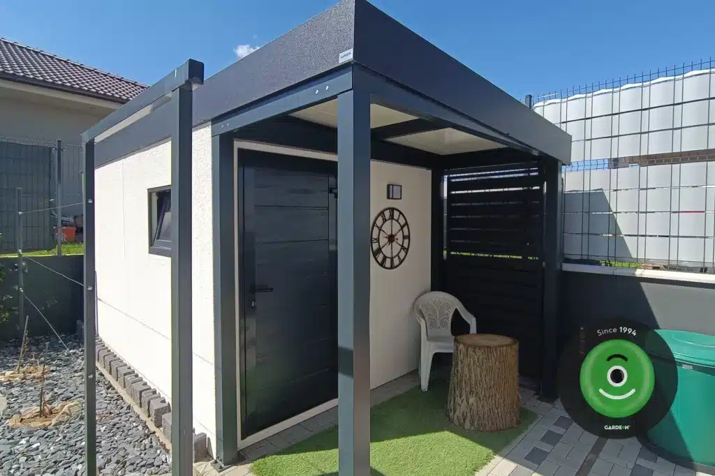 Všetkým týmto strateným podmienkam domček skvelo odolal. Stojí pevne na svojom mieste, nezateká a čo ma zatiaľ veľmi teší je, že ani omietkové steny nejavia žiadnu známku poškodenia či degradácie. Viem, je to iba rok, čo u mňa stoji, ale som presvedčená, že ani o ďalších 5 rokov sa nič nezmení. V domčeku mám uložené všetky potreby a pomôcky do záhrady od kosačky, vertikutátora, cez náradie až po rôzne hnojivá. Tiež v rohu uskladňujem pneumatiky, ktoré práve nemám obuté. Na tieto účely je domček úplne ideálny. Svoje rozhodnutie vybrať si domček od Gardeon som neoľutovala ani na chvíľu.