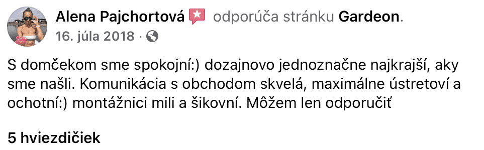 „Čo sa týka spokojnosti s domčekom, sme spokojní nadmieru :) Ochotne vás vždy odporúčam známym, ktorí niečo podobné zháňajú – či domček, alebo garáž.“