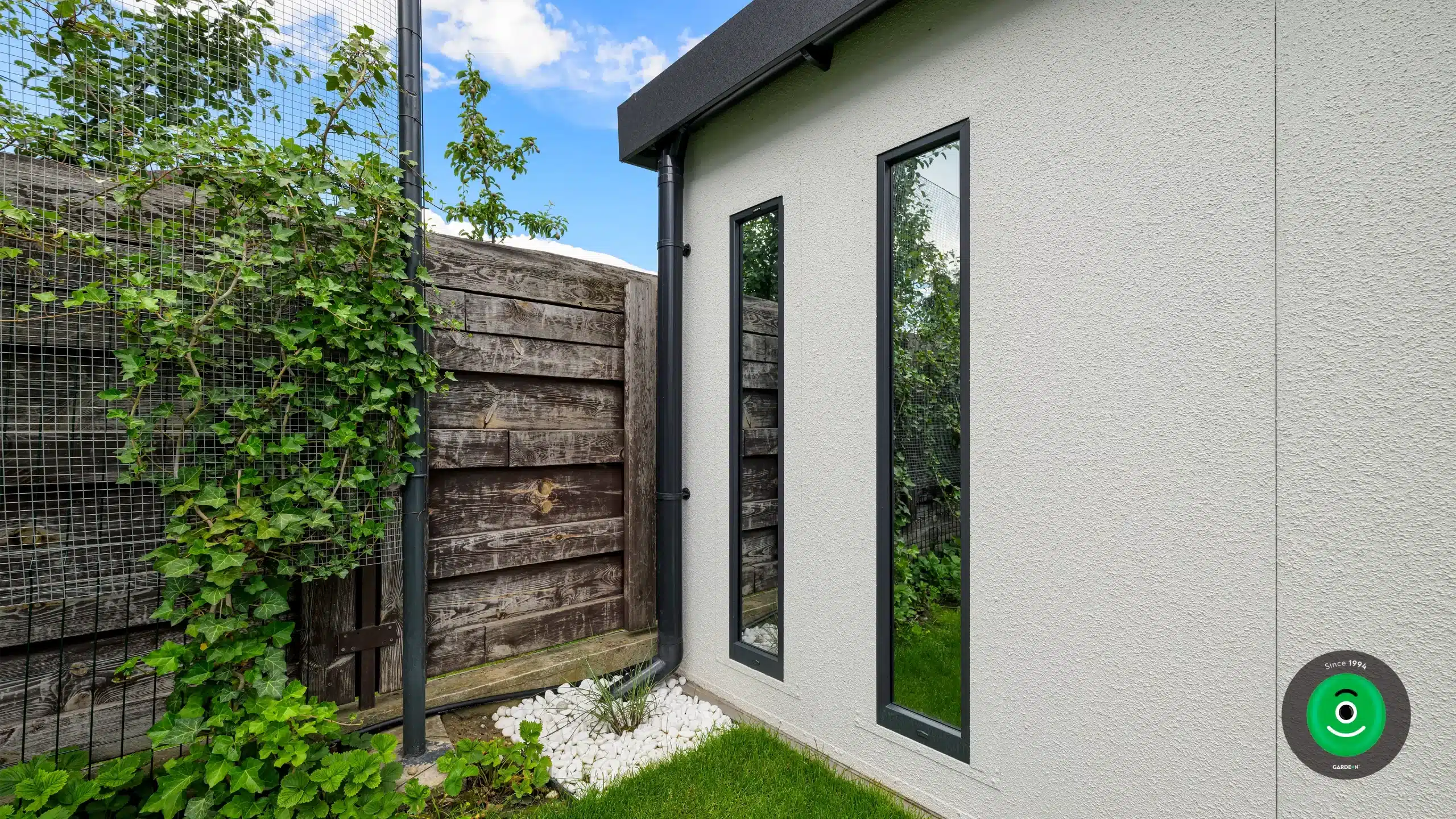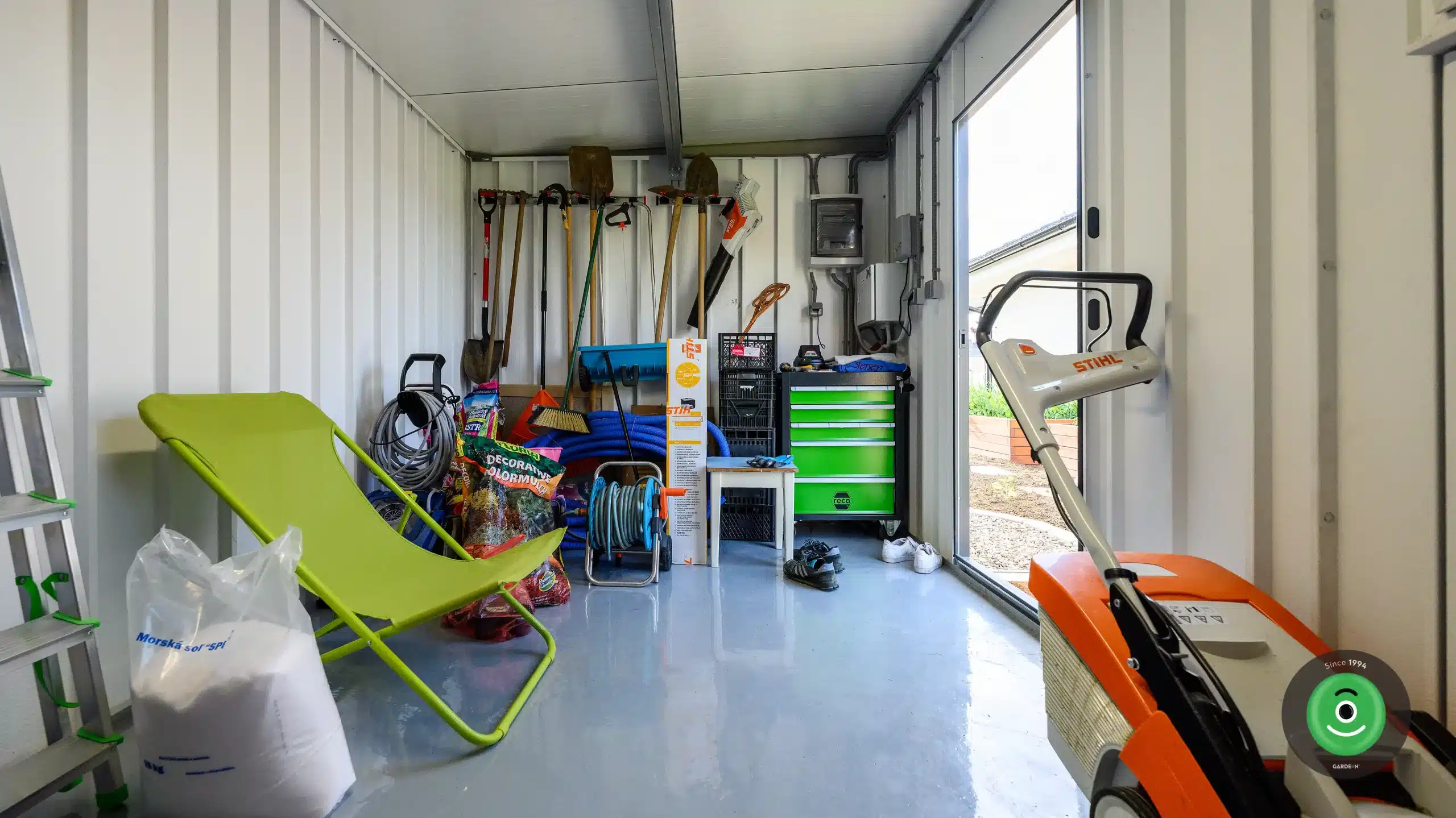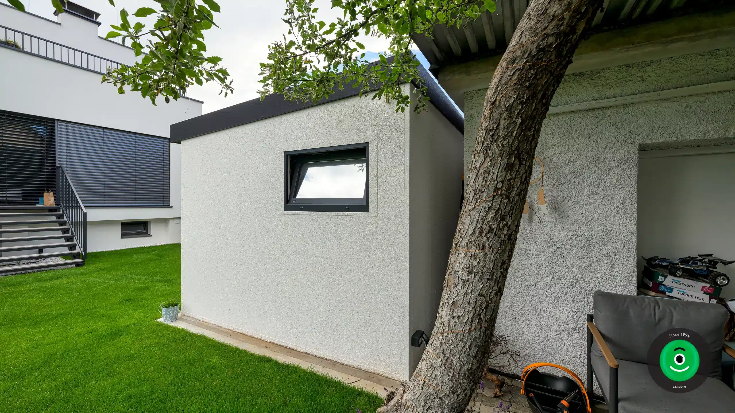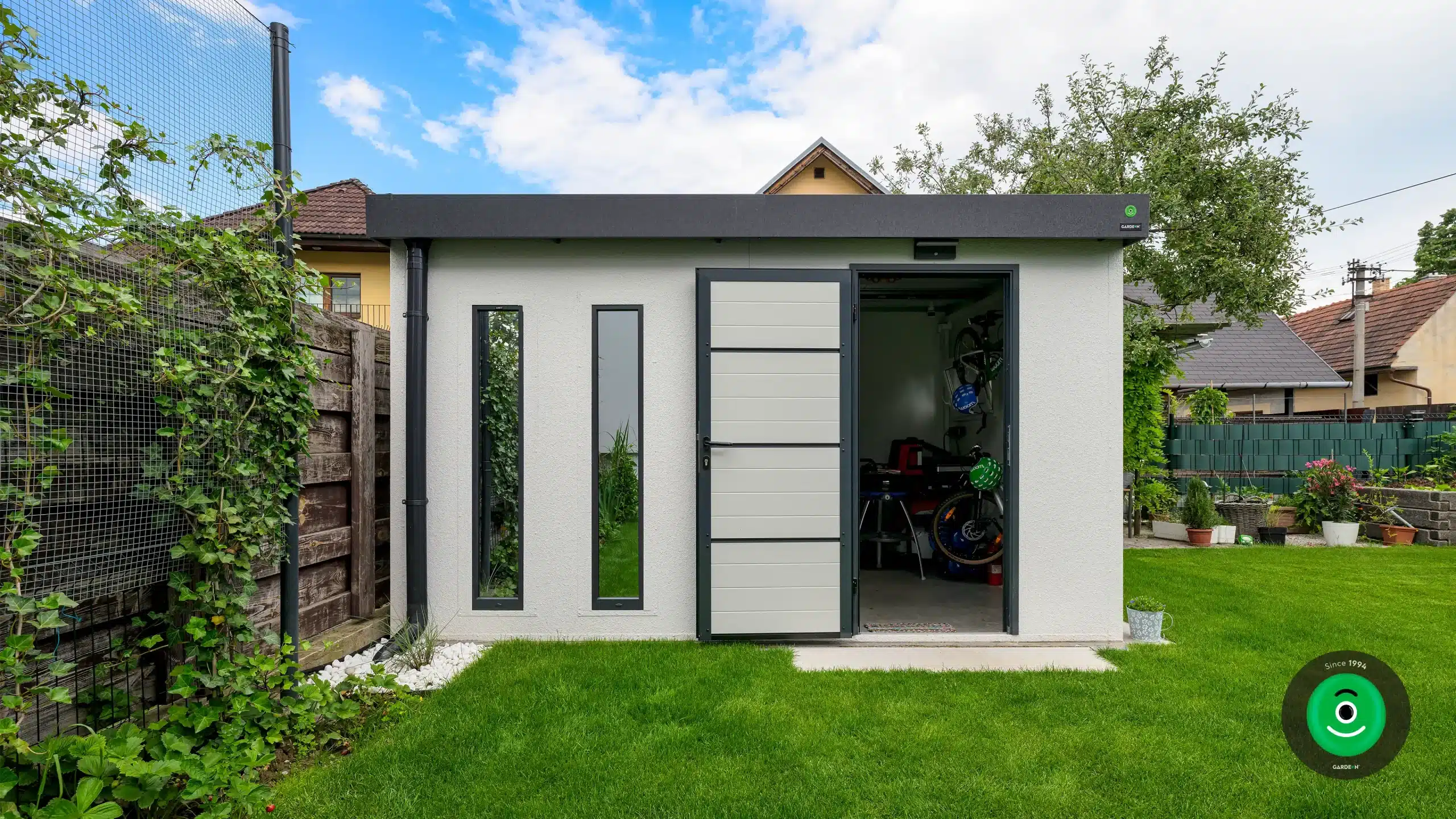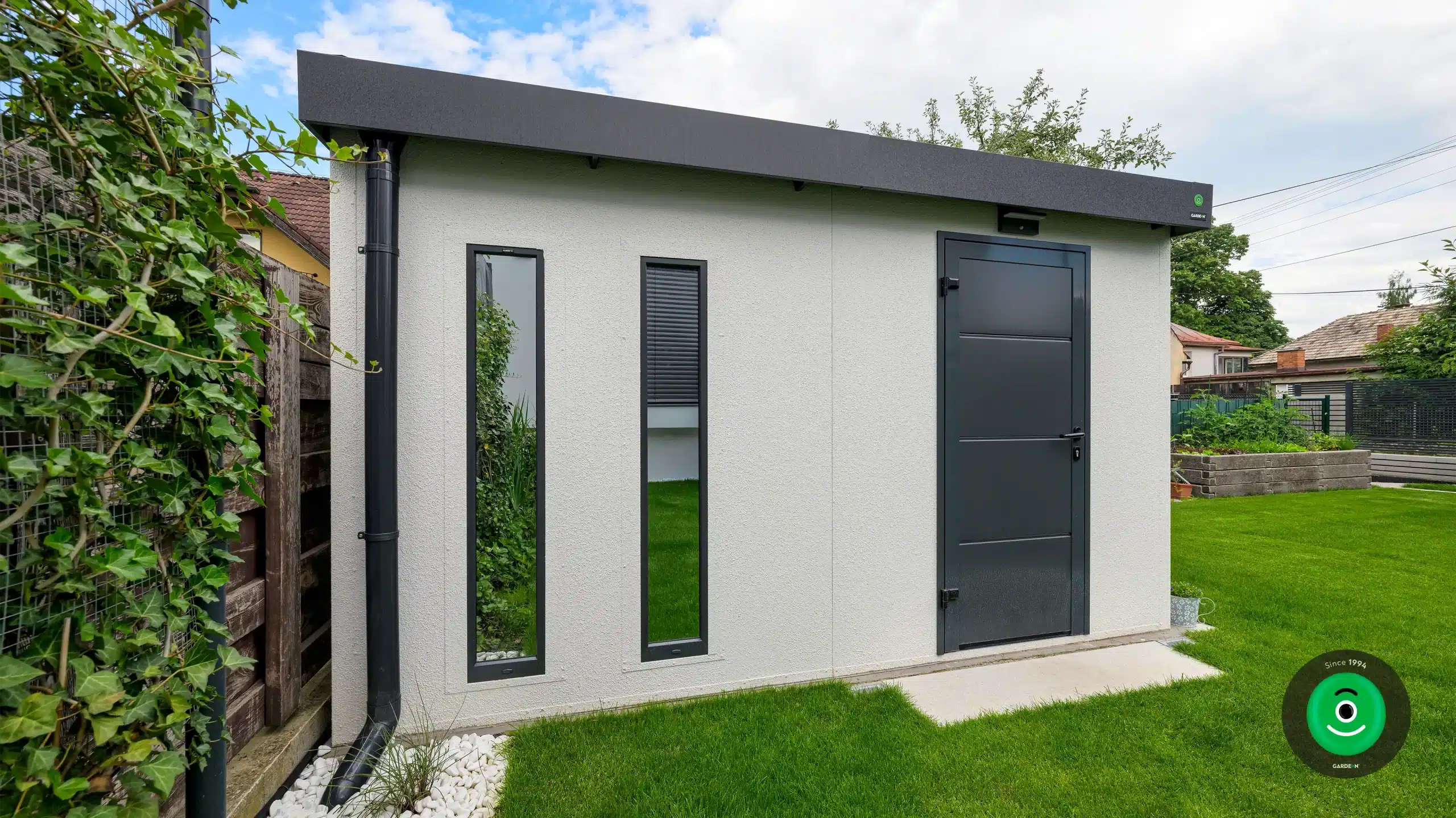 Steny domčeka GARDEON sú povrchovo upravené špeciálnou omietkou Permuro od švajčiarskej značky KABE, vďaka čomu vyzerá záhradný domček celkom ako murovaná stavba. Moderná konštrukcia montovaných stien však prináša úsporu miesta, ktoré tak môžete prakticky využiť.