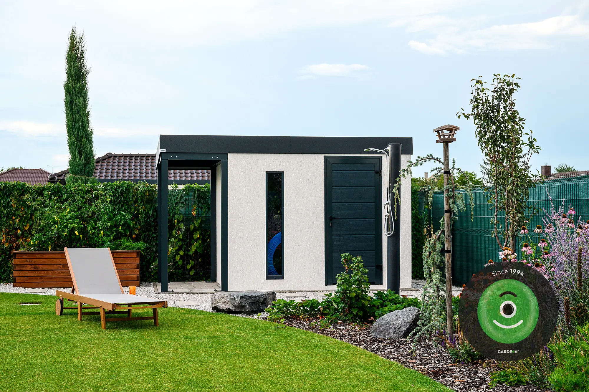 Bledosivý záhradný domček s prístreškom a antracitovou výplňou